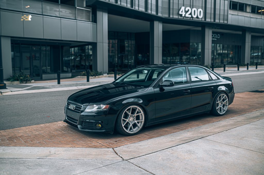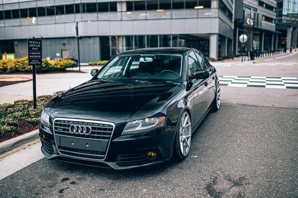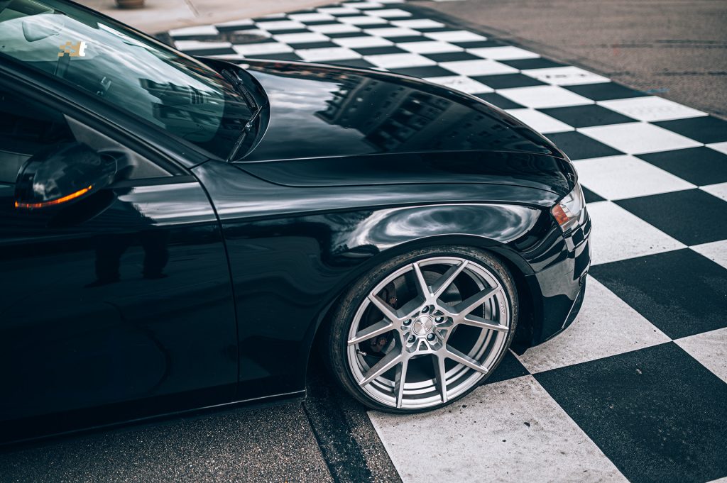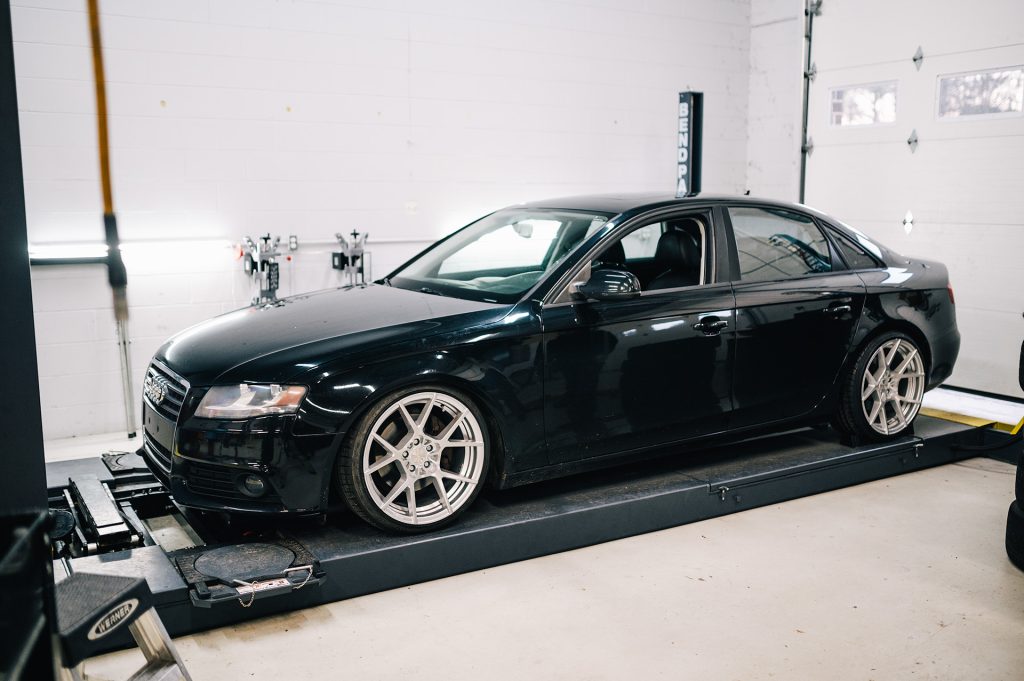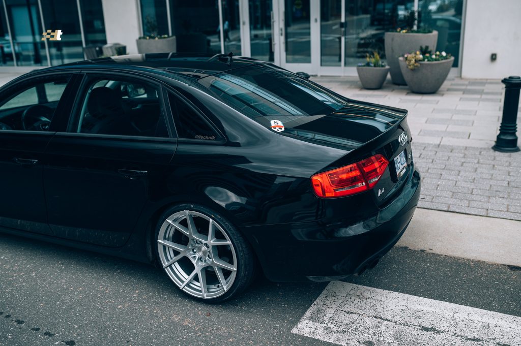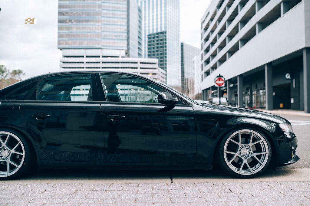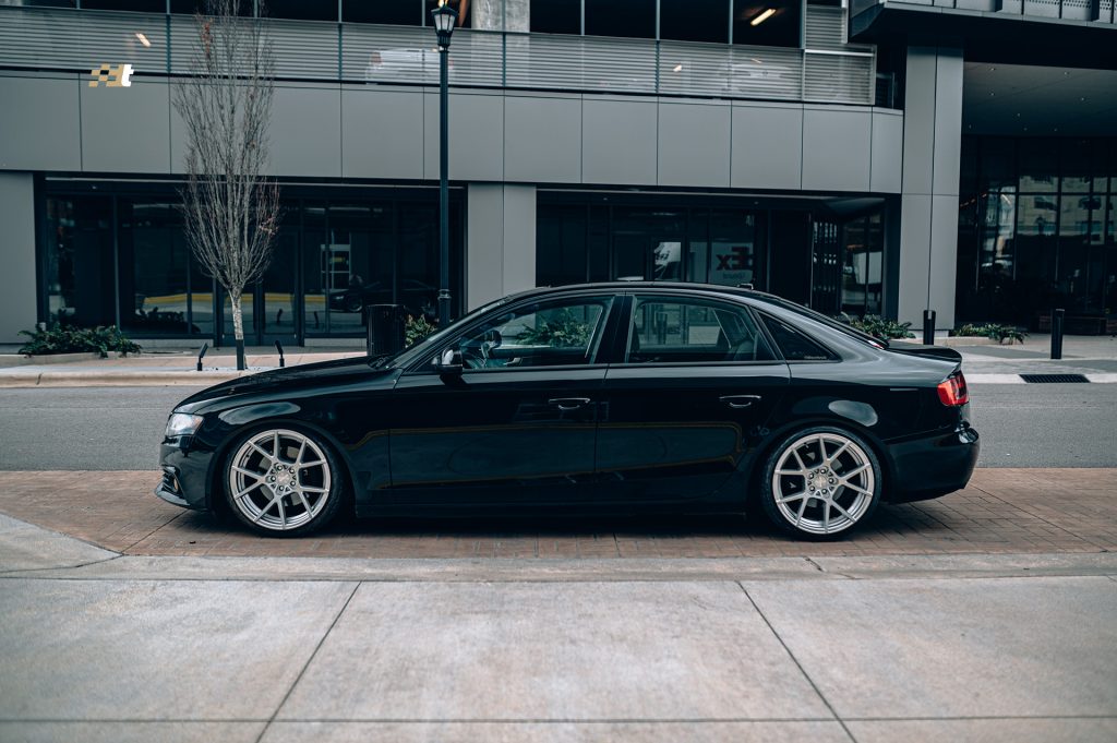 What’s that? You wanted to see more after shots of suspension installs and wheels and tires? We got you covered. This time around we applied the KISS method to one of our own vehicles. Morgan, our service advisor, has very patiently been awaiting the day that we could get his B8 A4 daily driver sitting right, and that day has come. And being that it is a daily driver he chose the less is more route and the results speak for themselves. Noticeably yet functionally lowered on Solo-Werks coilovers, with a set of Rotiform KPS wheels, the looks have instantly transformed. The wheels are finished in silver and run 19×10″ all the way around. And while those wheel dimensions might sound aggressive the photos don’t lie, the fit is spot on. Driving mannerisms are still very reasonable and perfectly well suited for urban roads. And to add just another subtle, yet classy touch, Morgan was gifted a Black Forest Industries GS2 shift knob to replace the less than ideal factory automatic shifter.