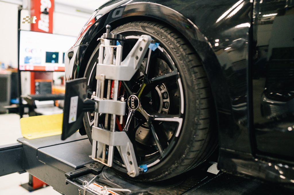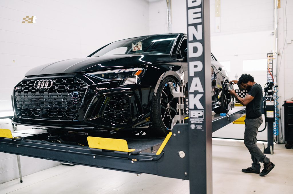 This 2023 8Y RS3 came in to get sitting right. We installed some @eibach_world lowering springs along with a set of wheel spacers to reduce the wheel gap and firm things up a bit. Of course no suspension install is complete without an alignment to ensure a straight track and long tire life. This is just of of a few shiny brand new Audis in the door today